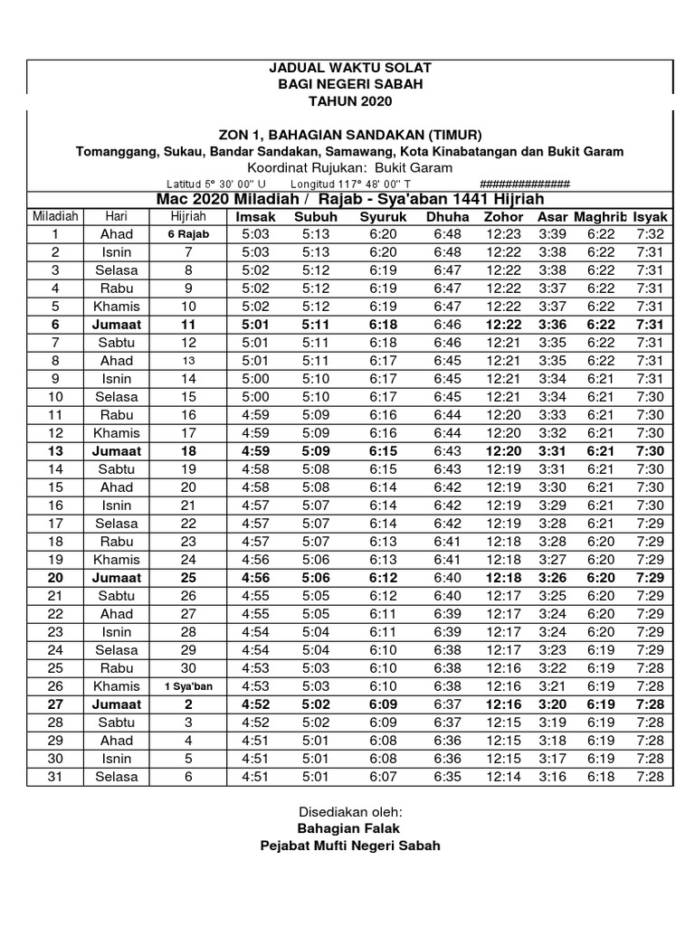 Jadual Waktu Solat Terkini Bagi Seluruh Negeri Sabah Tahun 1441h 2020 Mac Ogos Pdf